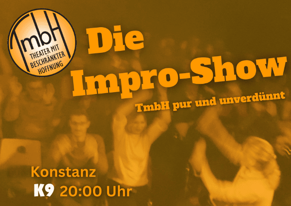 ![]() Was passiert, wenn man ein paar spielwütige Improleute auf eine leere Bühne stellt und sie dann mit ein paar Vorschlägen füttert, könnt Ihr bei unserer Impro-Show sehen: TmbH lässt es richtig krachen! Hier zählen Eure Ideen und unsere Inspiration – zusammen ergibt das einen Abend voller Ideen, Gags, Geschichten und Charaktere, die Euch überraschen werden. So gab’s das vorher noch nie, so gibt’s das nachher nie wieder, deshalb: Sei dabei! |