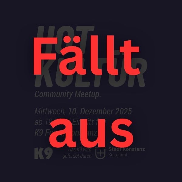 ![]() Der monatliche Kulturstammtisch muss diesen Monat aufgrund einer Terminüberschneidung leider ausfallen. Wir wünschen euch allen einen guten Rutsch ins neue Jahr und freuen uns, euch im Januar wieder bei "Hot Kultür" begrüßen zu dürfen. Euer K9-Team |