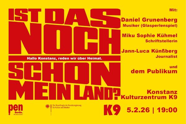 ![]() Mit einer großen Gesprächsreihe durch Baden-Württemberg vor den Landtagswahlen lädt PEN Berlin zu Debatten über Heimat und Demokratie ein. Zwei Gäste aus unterschiedlichen gesellschaftlichen Bereichen treffen aufeinander – und auf das Publikum. Denn hier ist das Publikum nicht Beiwerk, sondern der dritte Gast: Es diskutiert, widerspricht, ergänzt und prägt den Abend entscheidend mit. Ein offenes Gespräch darüber, was die Gesellschaft zusammenhält und sie auseinander zu reißen droht. Der PEN Berlin ist eine politisch engagierte Vereinigung von im deutschsprachigen Raum tätigen oder auf Deutsch schreibenden Schriftsteller*innen, Publizist*innen, Journalist*innen und anderen Kulturschaffenden. Er setzt sich für verfolgte und exilierte Autor*innen sowie für Kunstfreiheit, Meinungsvielfalt, Demokratie und Menschenrechte ein. Schreiben wird dabei nicht als unpolitischer Rückzugsort verstanden, sondern als Verantwortung gegenüber der Gesellschaft. LINE-UP: Moderation: Jann-Luca Künßberg (Journalist und Autor, u.a. taz, Südkurier, Correctiv) Gäste: Miku Sophie Kümel (Autorin, u.a. tätig als Atelierautorin am Deutschen Theater Berlin) & Daniel Grunenberg (Musiker, Teil des erfolgreichen Electropop-Duos Glasperlenspiel Saalmikrofone/Orga: Aron Boks, Deniz Yücel |